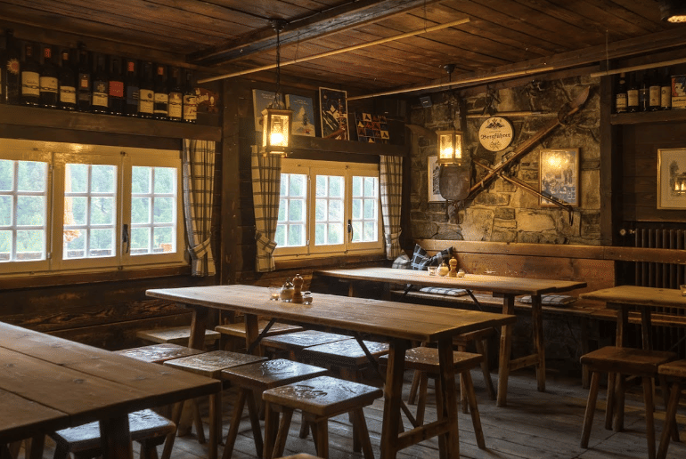 The Brown Cow Pub is located in the lively Unique Hotel Post on Bahnhofstrasse and offers an American dining experience in Zermatt. Always bustling, this cheerful spot serves up delicious burgers with thick, crispy fries, nachos with melted cheese and chicken wings. It’s family-friendly with small dishes and good salads for kids. This is one of the most welcoming Zermatt restaurants for a true taste of Switzerland.